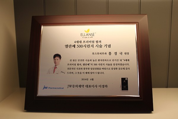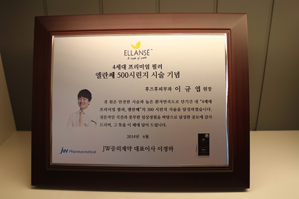 4세대 프리미엄 필러, 엘란쎄의 500 시린지 시술을 달성하신 공로를 인정받아 상패를 수여 받으셨습니다.
