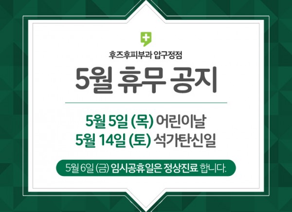 [공지] 5월 진료(휴무)안내 페이지 정보 작성자 통합관리자 작성일16-04-29 12:14 조회2,413회 댓글0건 관련링크 이전글 수정 삭제 목록 본문 댓글목록 등록된 댓글이 없습니다. 이전글 수정 삭제 목록