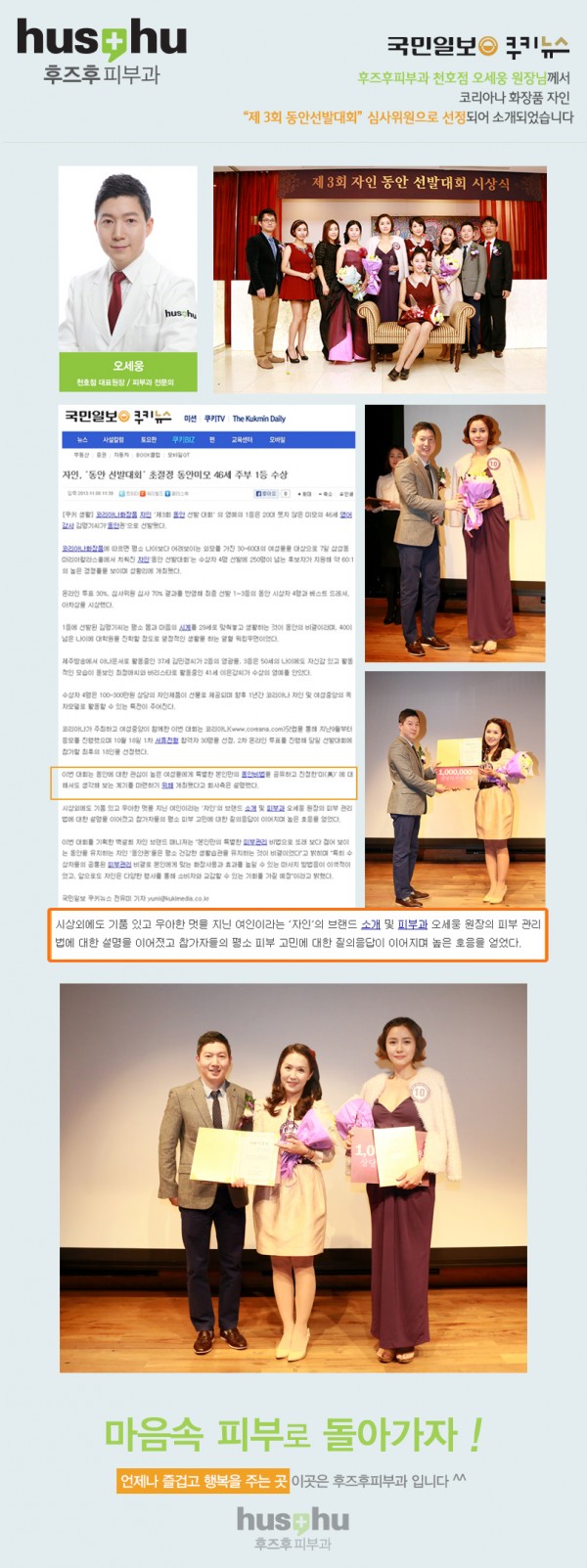 [공지] 오세웅 원장 코리아나 화장품 자인 "동안선발대회" 심사위원 선정! 페이지 정보 작성자 관리자 작성일13-11-14 16:08 조회2,686회 댓글0건 관련링크 이전글 수정 삭제 목록 본문 댓글목록 등록된 댓글이 없습니다. 이전글 수정 삭제 목록