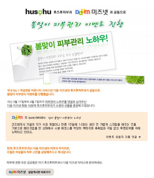 [110420] 후즈후-다음 미즈넷과 공동으로 봄맞이 피부관리 이벤트 진행 페이지 정보 작성자 관리자 작성일12-04-13 14:54 조회2,713회 댓글0건 관련링크 이전글 수정 삭제 목록 본문 댓글목록 등록된 댓글이 없습니다. 이전글 수정 삭제 목록